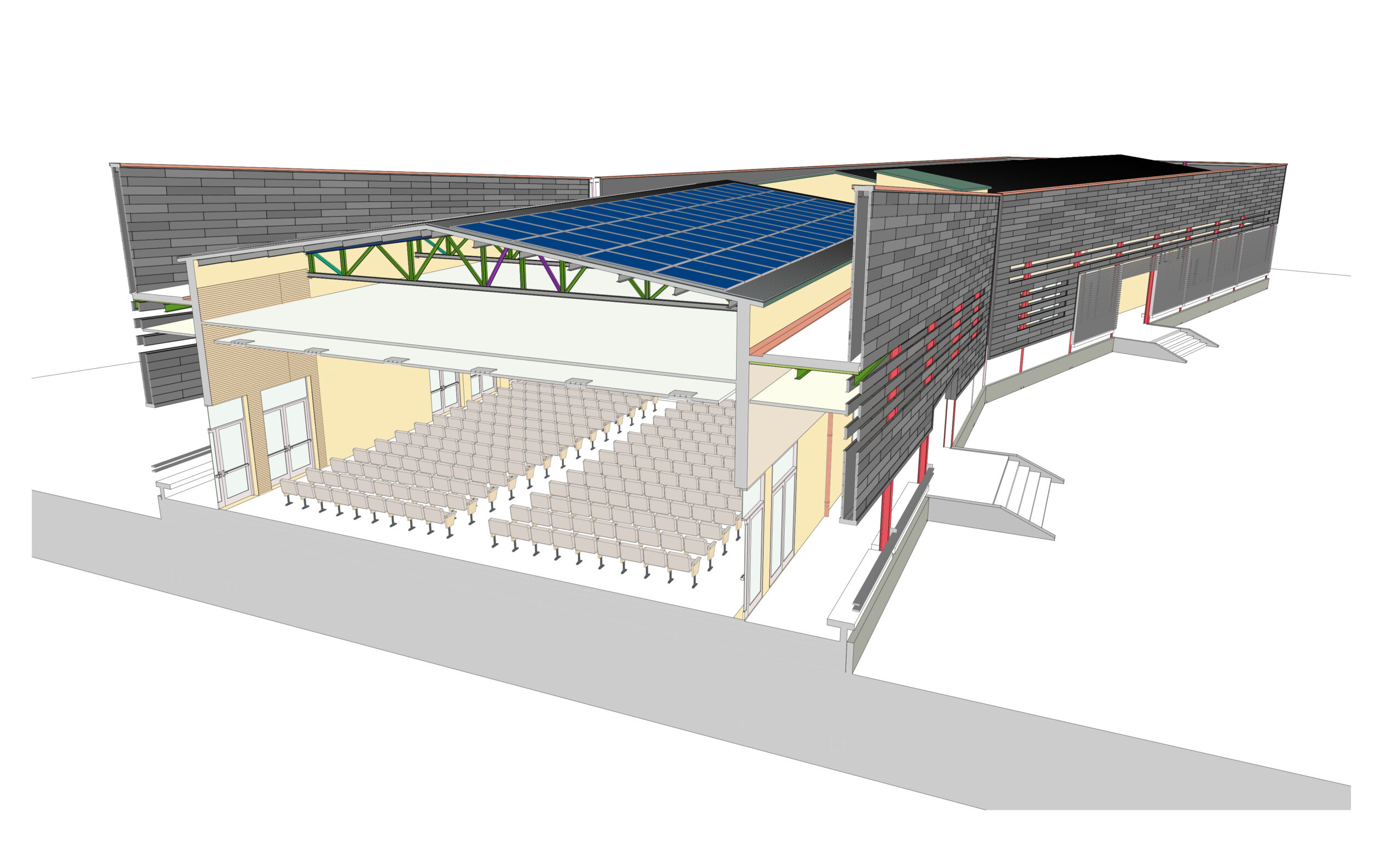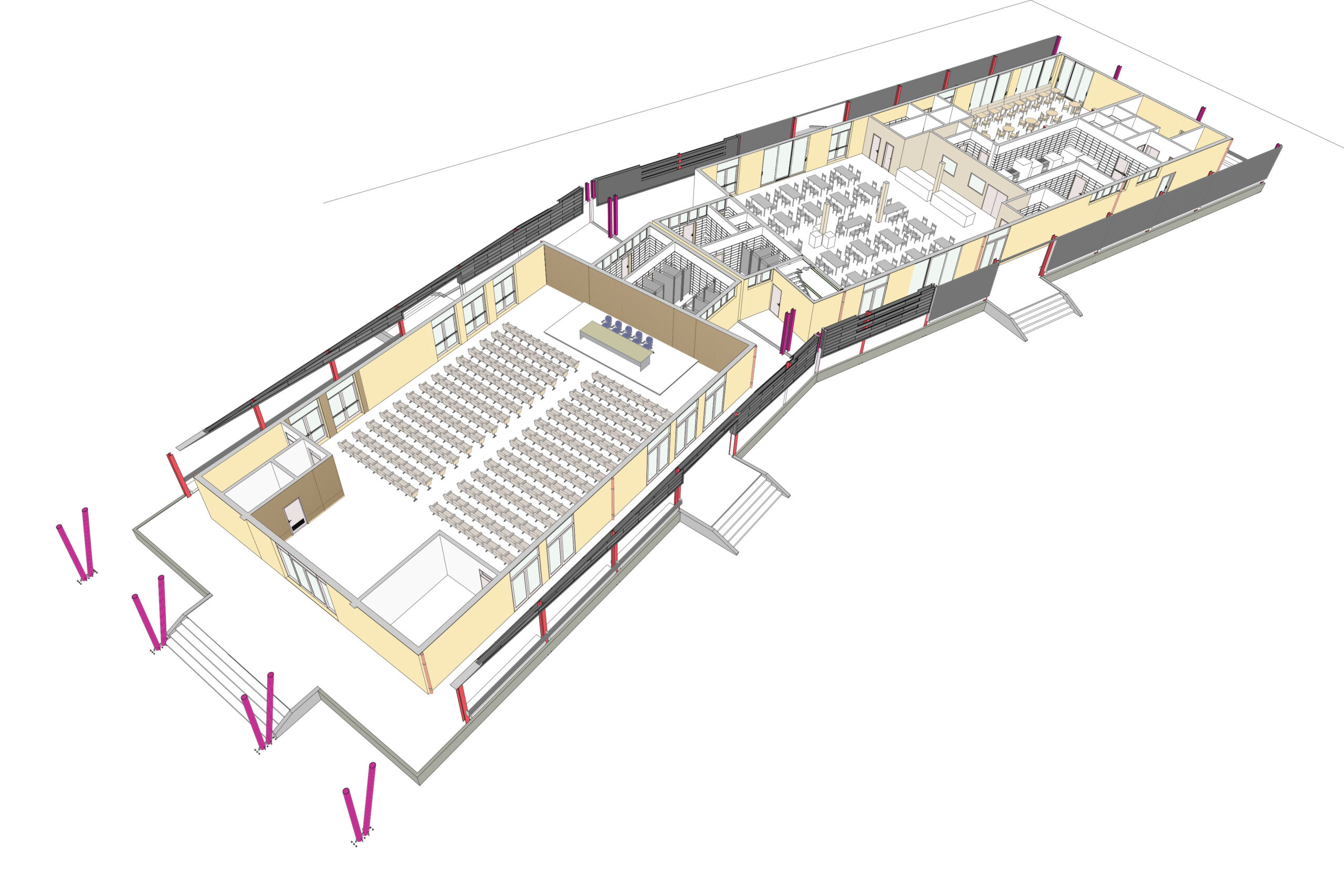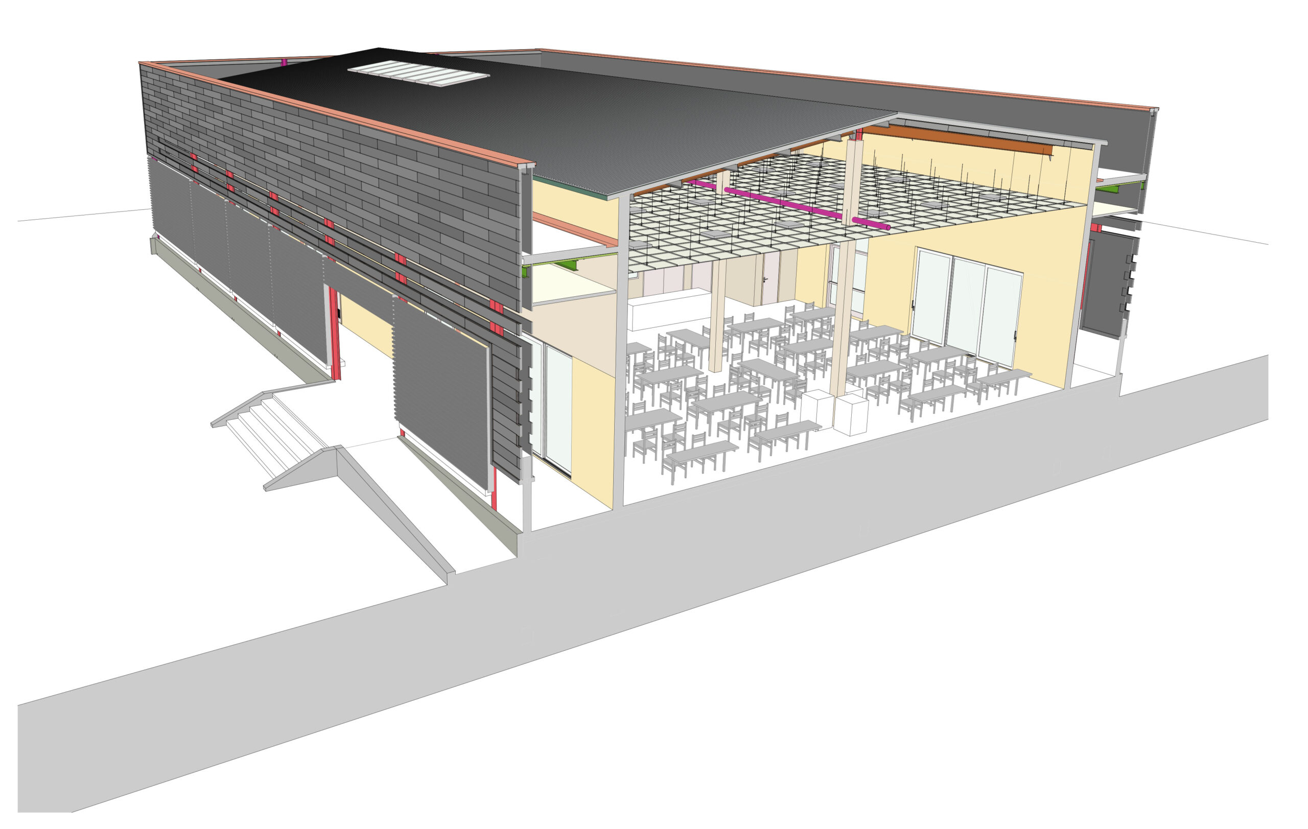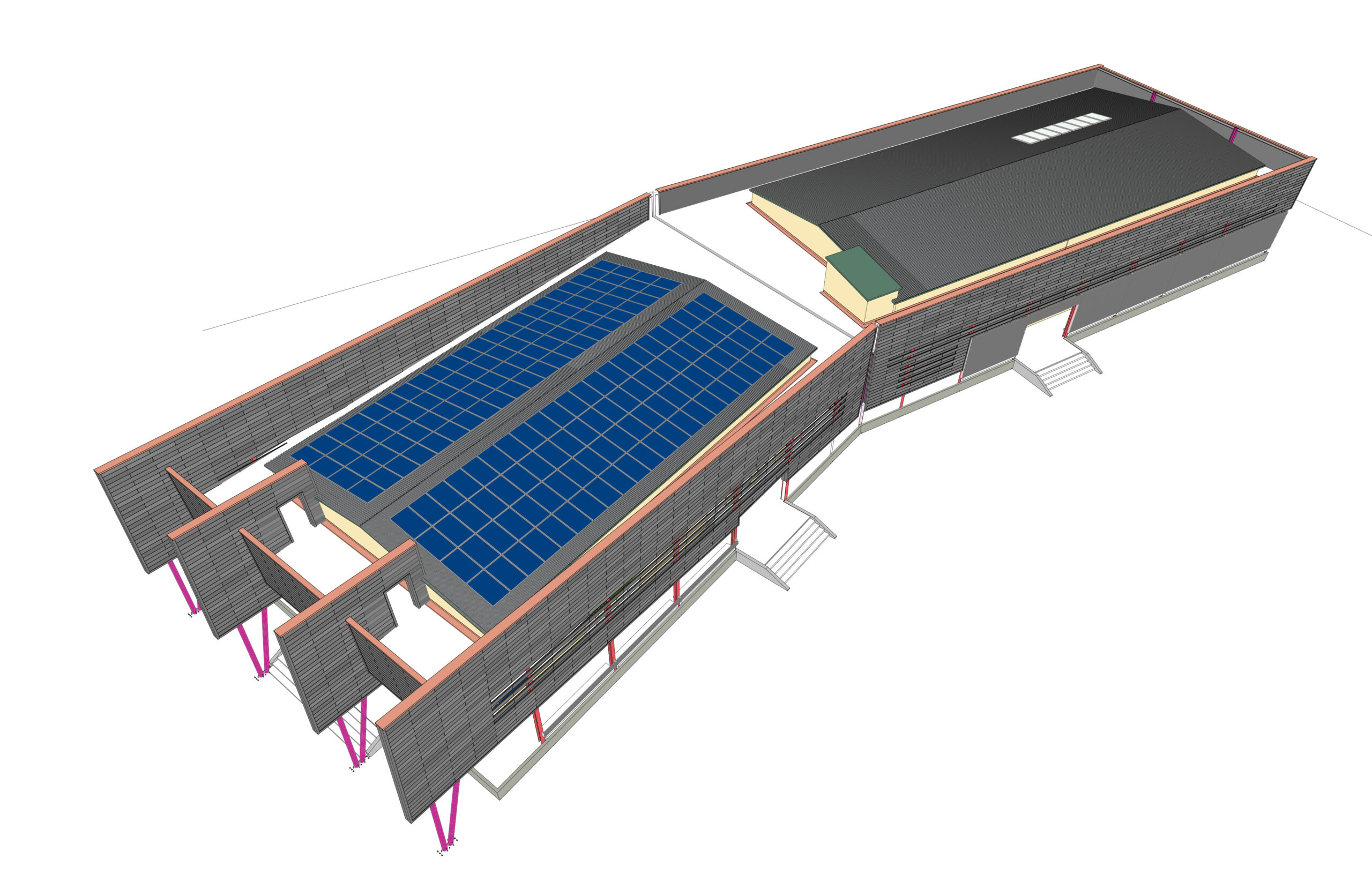 LMV World participe au projet avec la construction des structures du bâtiment de la salle polyvalente et avec la construction de la structure de couverture de 12 bâtiments, y compris les finitions extérieures. LMV World fournit environ 300 tonnes de charpente métallique.
