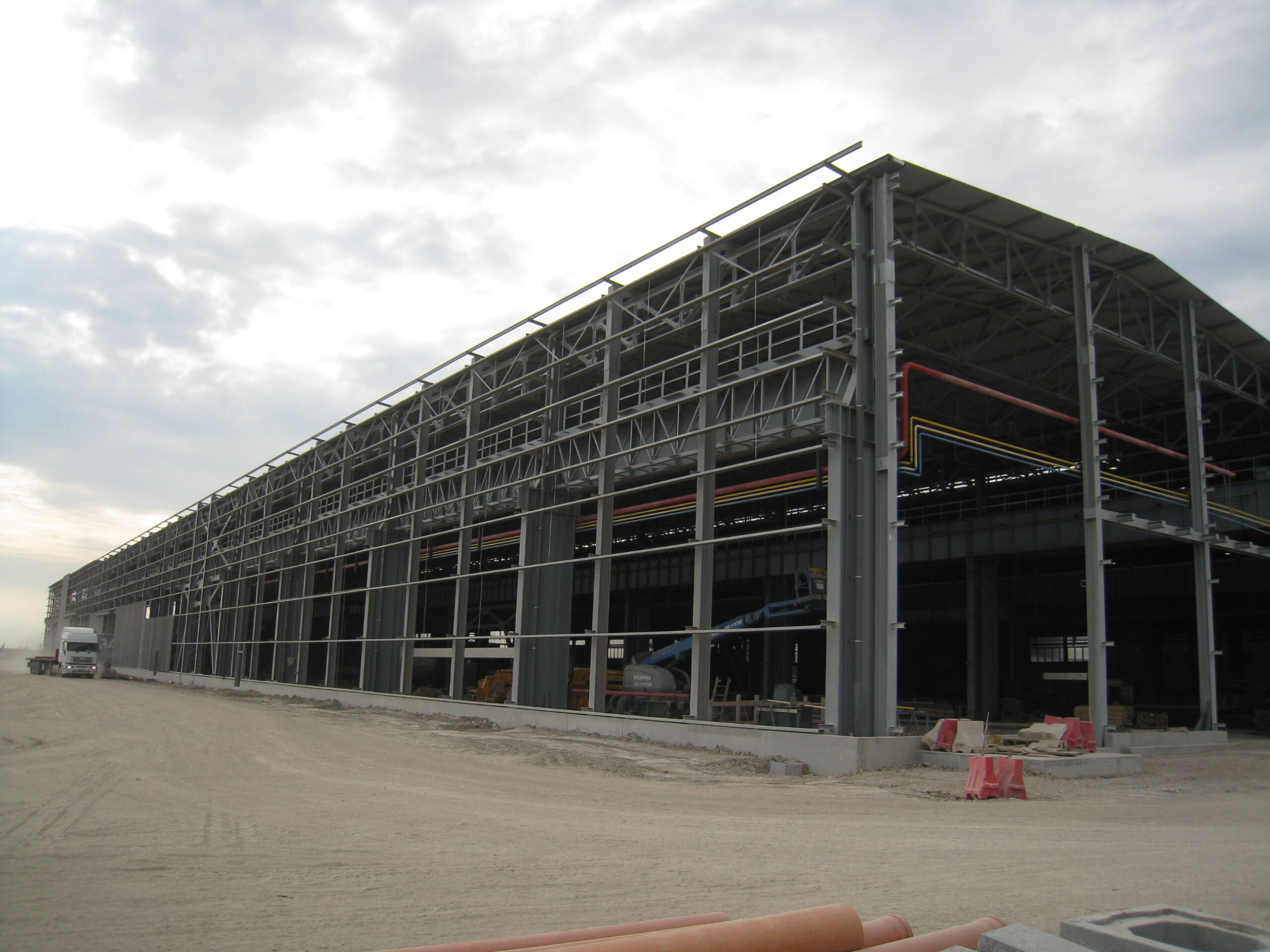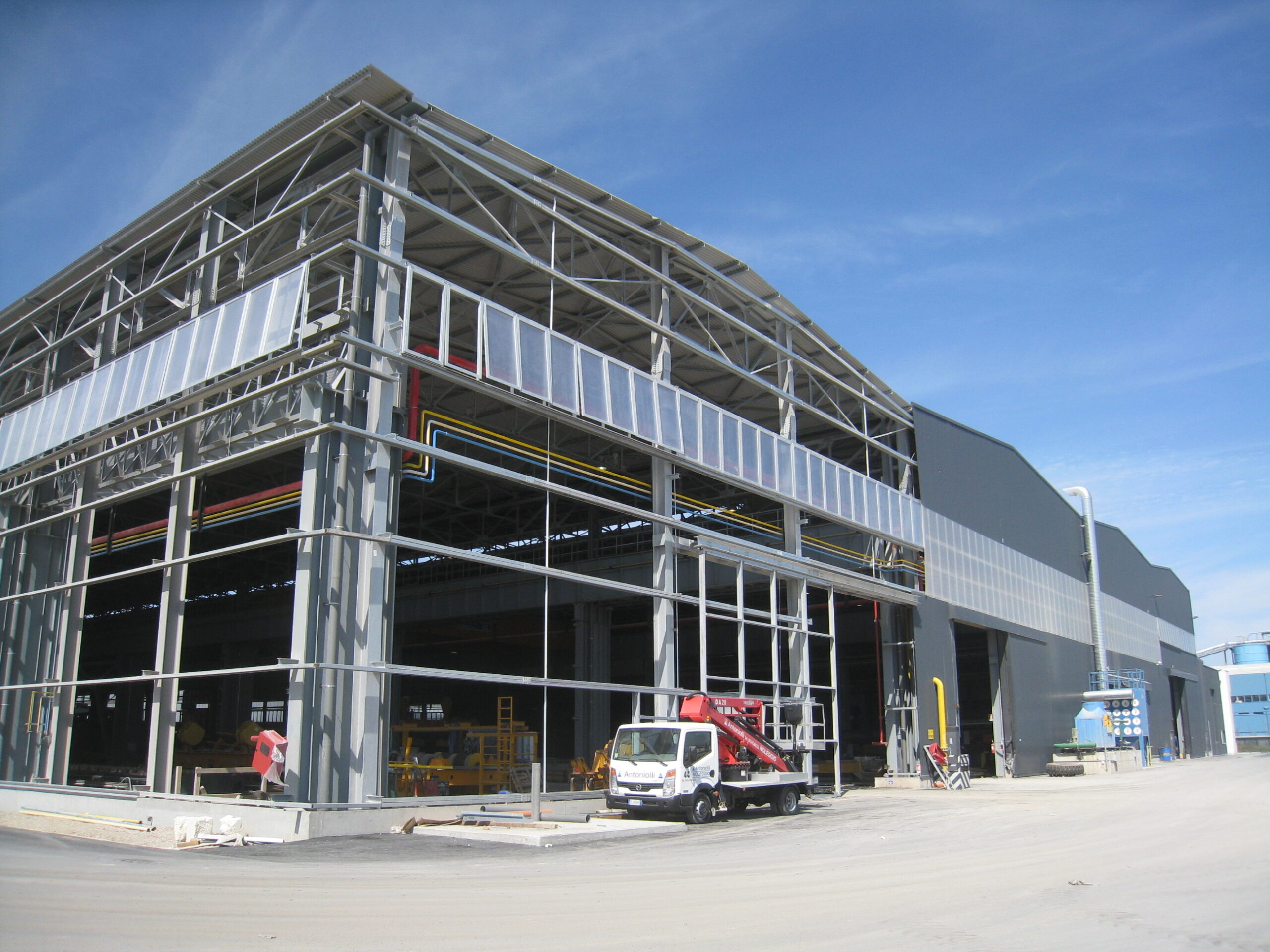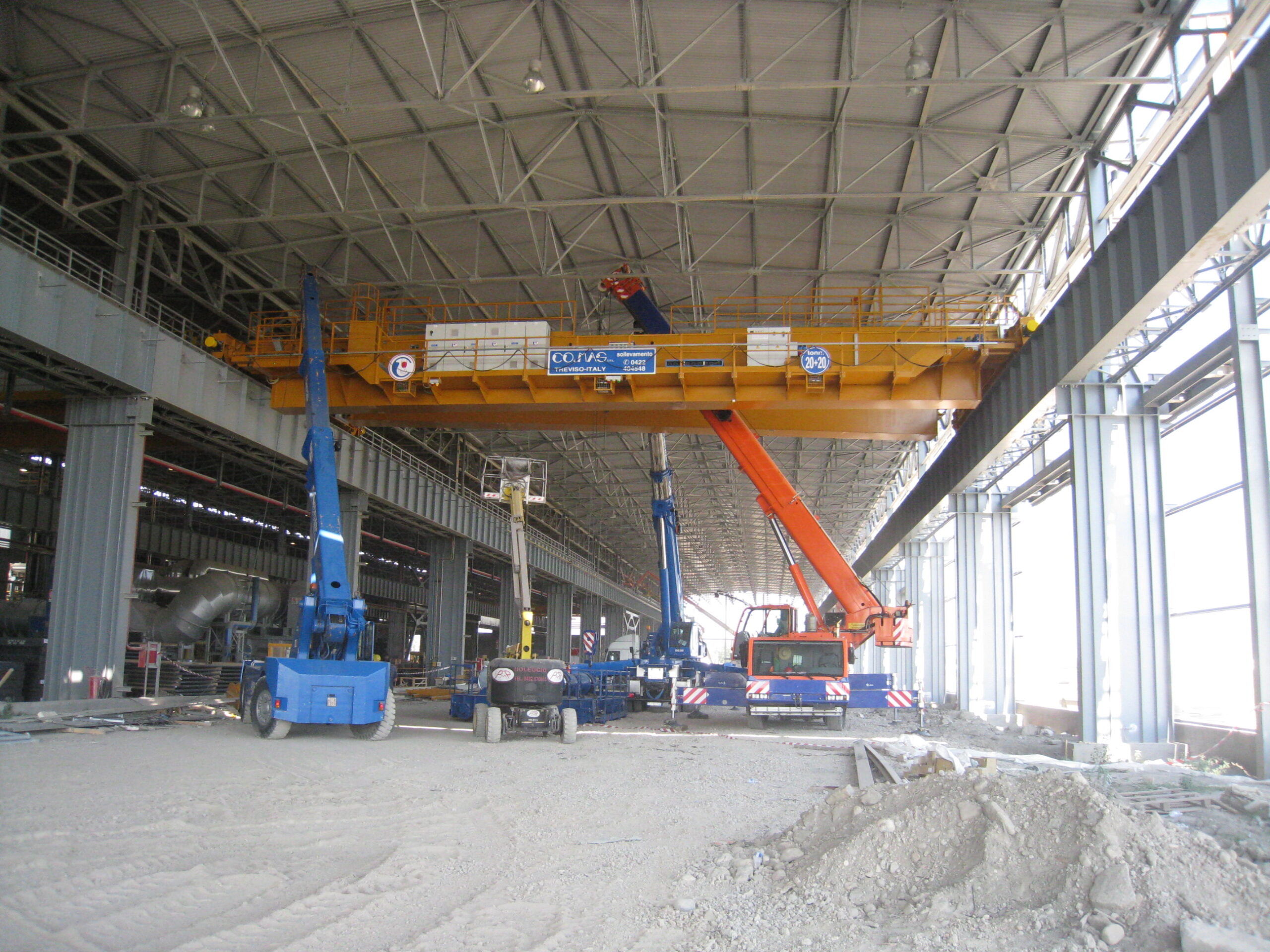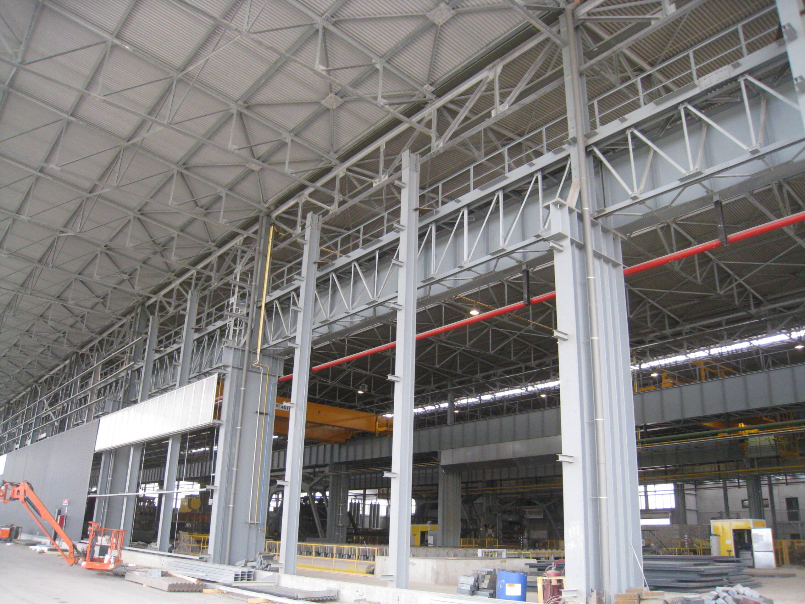 Construction d’un bâtiment industriel de 15 000 m2 pour le laminoir à trois travées (25 m x 200 m, H = 15 m) et de guides pour la grue de 60 t. Le bâtiment étant conçu pour les opérations de laminage, la particularité réside dans la construction de ses structures : les poutres (2 m x 15 m) et les guides soudés à pleine pénétration.
